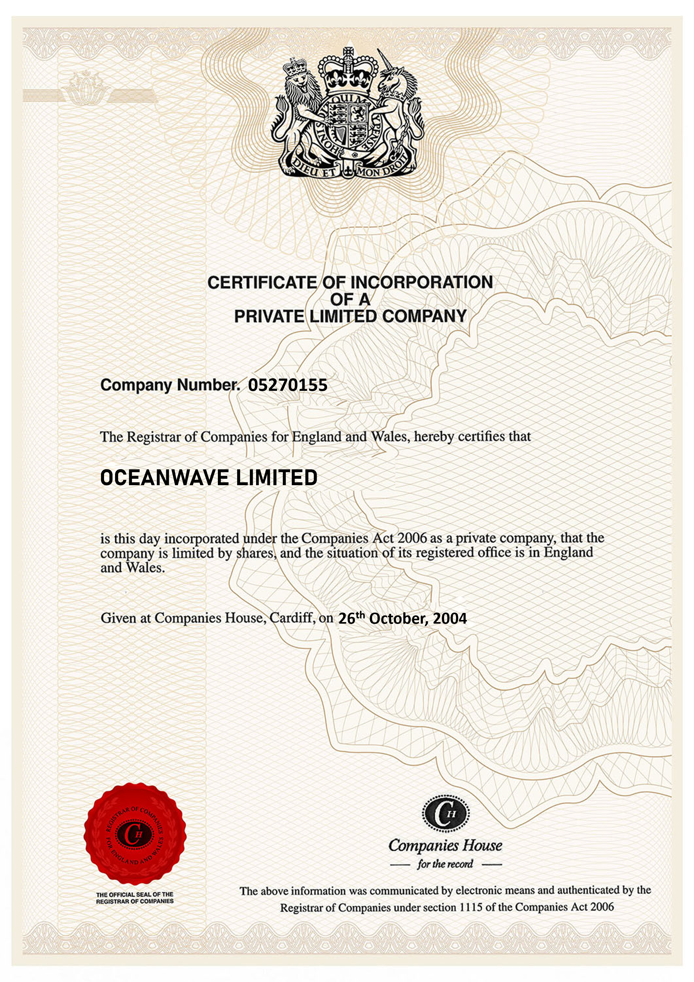oceanwavelimited.com is a registered in the United Kingdom: Certificate.